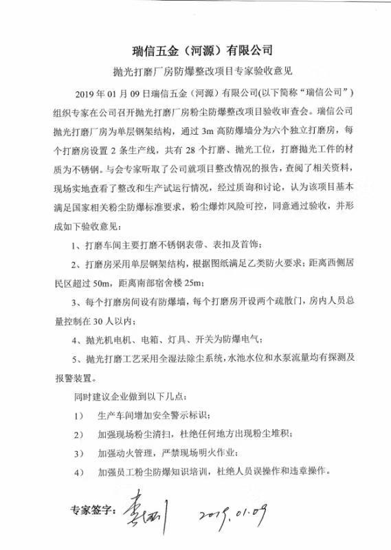 瑞信五金(河源)有限公司工程已于12月13日竣工 瑞信五金(河源)有限公司的前身是兴固五金(深圳)有限公司,公司成立于1973年,主要生产经营五金制品(表带、皮表带)、不锈钢/五金、钛五金制品,是全球高档表的主要供应商。 产尘工序:打磨抛光 产尘设备:双轮打磨机(共140工位) 粉尘类型:不锈钢粉尘 除尘方式:全湿法除尘