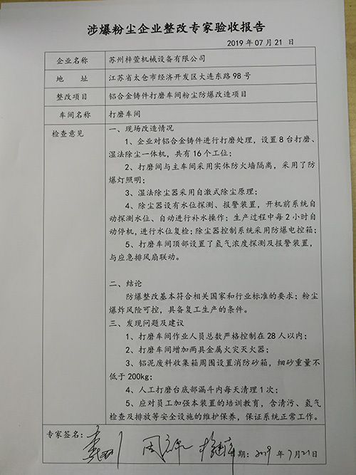 梓萱机械设备有限公司粉尘防爆工程已于2019年07月18日竣工。